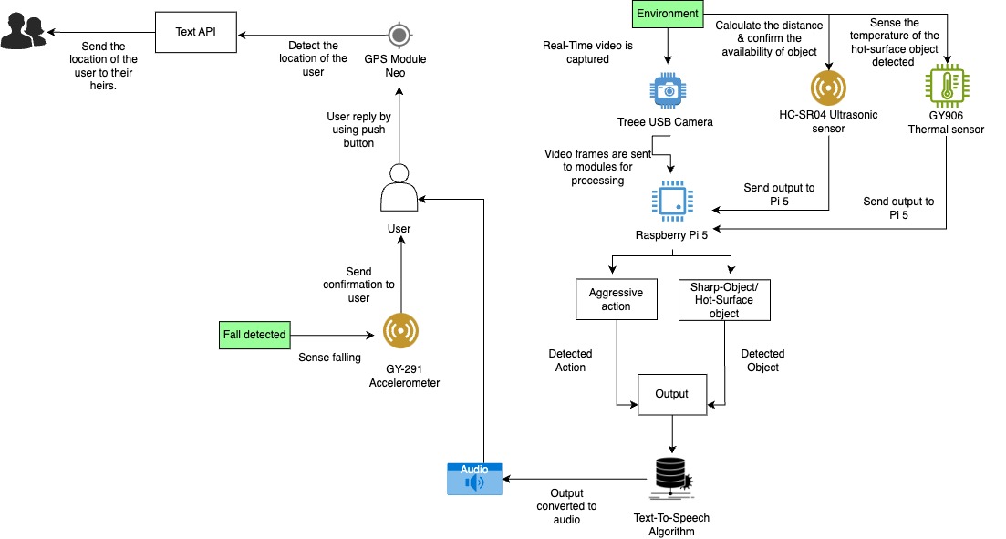 This project is conducted in collaboration with PERMIUM (Persatuan Mahasiswa Istimewa Universiti Malaya) as part of stakeholder collaboration initiatives. Various data gathering methods, including surveys and sessions with stakeholders, are used to collect the necessary knowledge and information to understand the features and requirements of the project. The project is being developed using the Waterfall methodology, which allows for easy modification and application. System analysis and design are carried out based on the project's requirements, such as detecting sharp objects, detecting hot surfaces, detecting falls, and generating real-time output.